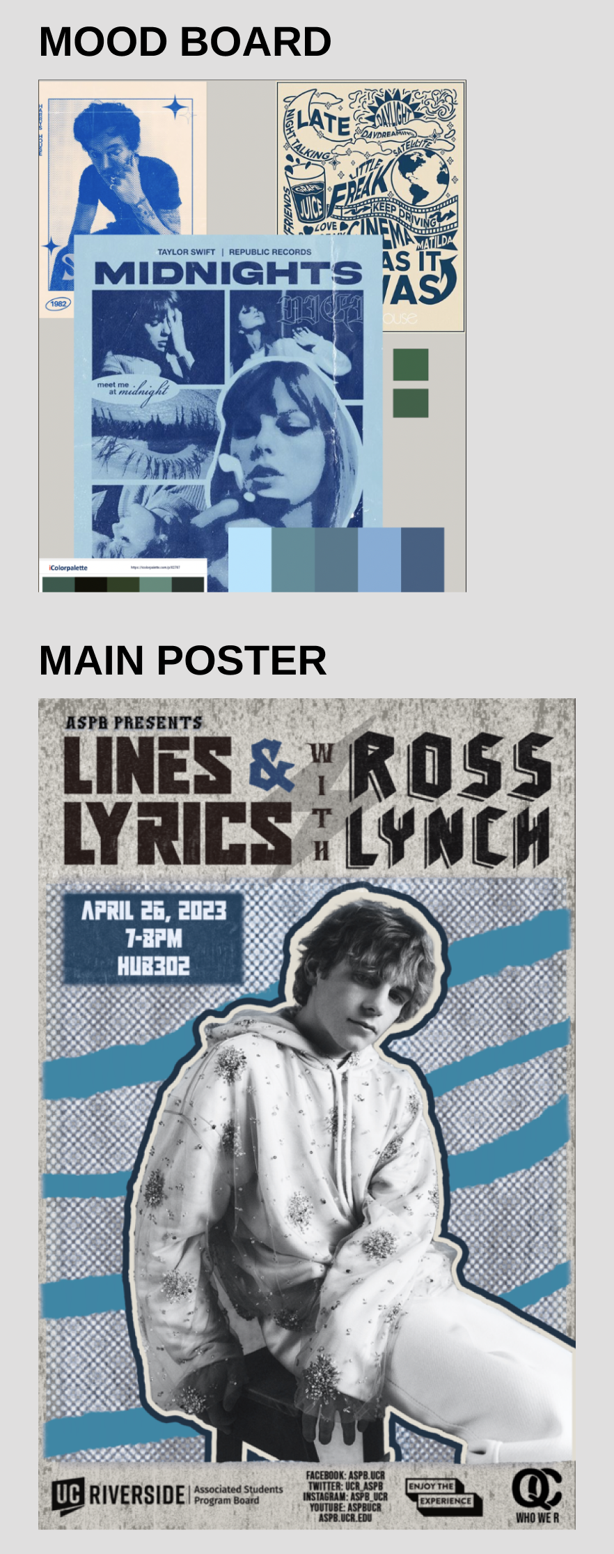 Lines & Lyrics with Ross Lynch was our annual spring quarter guest lecturer event. Ross Lynch is a popular singer and actor. He previously the lead vocalist for the band R5 and is currently in a band, The Driver Era. He previously acted on notable TV shows and movies that included Austin & Ally, Teen Beach Movie, My Friend Dahmer, and Chilling Adventures of Sabrina.