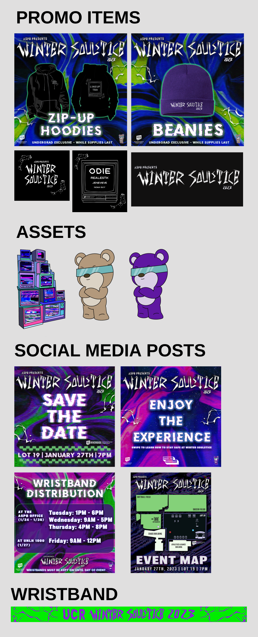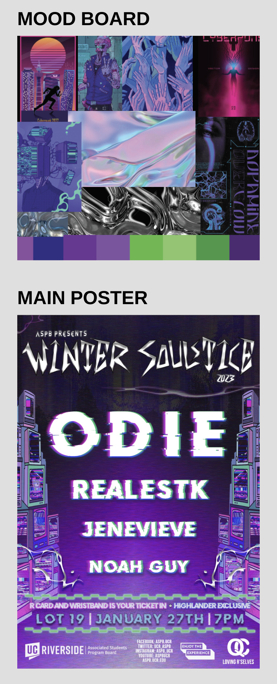 As the lead marketer for this event, I held the responsibility of curating the event's visual identity and overseeing all key marketing tasks. Given the expansive nature of this concert, the demand for an more graphics and designs were needed. The Pinterest board that was given for this event inspiration was heavily futuristic, cyber-punk, glitch, and neon-color inspired.