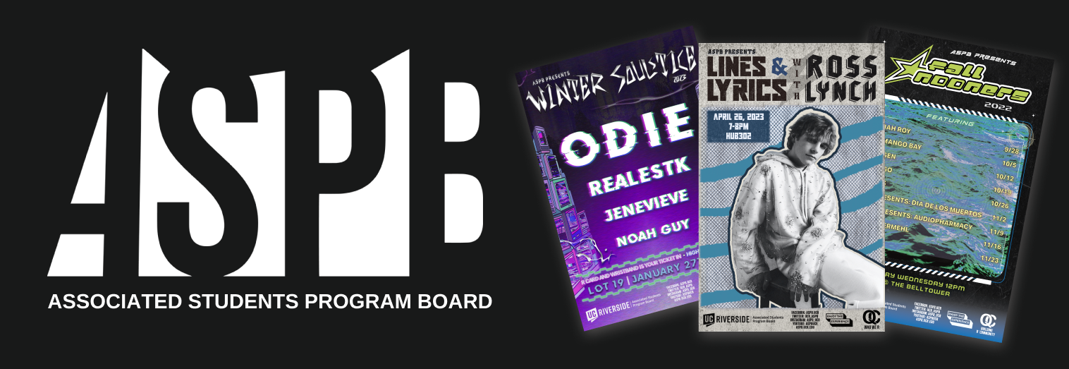 The Associated Students Program Board (ASPB) brings entertainment and special events to UC Riverside. The board is comprised of 15 full-time undergraduate students who work primarily, though not exclusively, in the following six divisions: Concerts, Special Events, Films & Lectures, Contemporary Culture, Marketing, and Leadership. Throughout the academic year, the student-run board hosts concerts, special events, films, and lectures for 25,000+ undergraduate students.